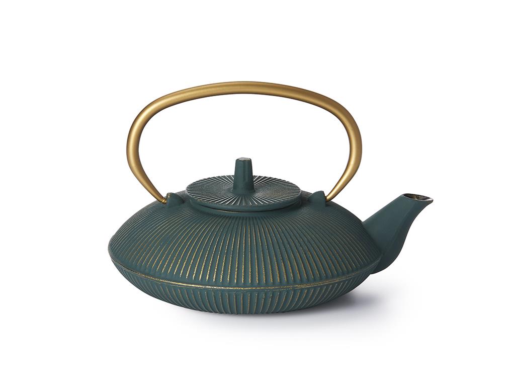 Kitajski čajnik iz litega železa. Priloženo kovinsko cedilo. Barva čajnika ob redni uporabi rahlo zbledi. Bodite pozorni, da ga ne položite direktno na svetle površine, ampak raje uporabite primeren podstavek.