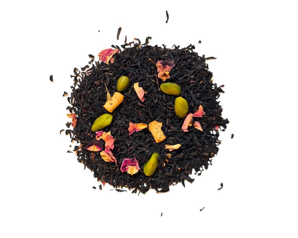 Sestavine: črni čaj, pistacije, liofilizirane marcipanove kapljice (mandlji, sladkor, vlažilno sredstvo: invertoza), vrtnični cvetovi, naravi identične arome.