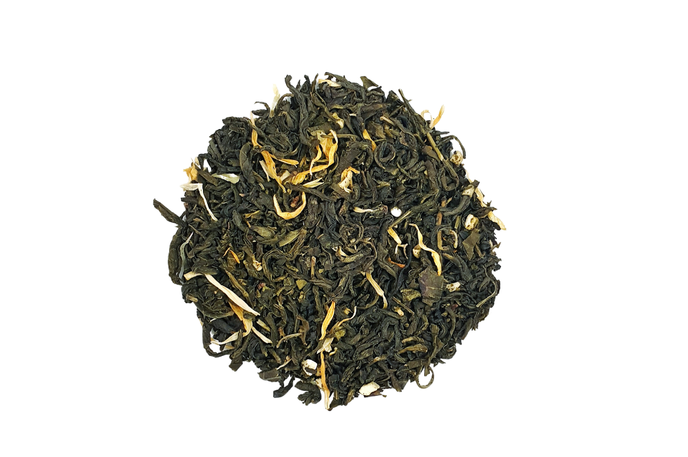 Kitajskemu zelenemu čaju* so dodani ognjičevi cvetovi*, koščki kandiranega manga* in naravna aroma manga. Napitek je nežno zelene barve in blago tropskega okusa.
