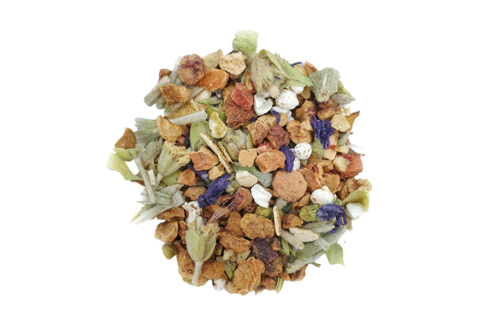 Sladko jabolko in rahlo pekoči ingver tvorita osnovo tega čaja, ki jo zaokrožita še grški gorski čaj in pomarančna lupina. Komarček doda prijetno sladkobo; pražena ajda, rdeče jagode in vijolični cvetovi sleza pa poskrbijo za atraktiven izgled čajne mešanice.
