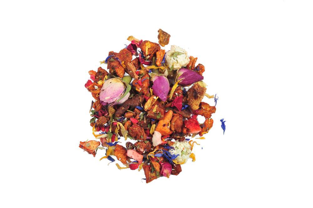 Koščki jabolka in hruške, jagode, maline, vrtnični in kamilični cvetovi, listi robide, cvetovi plavice in ognjiča, naravne in naravni identične arome.
