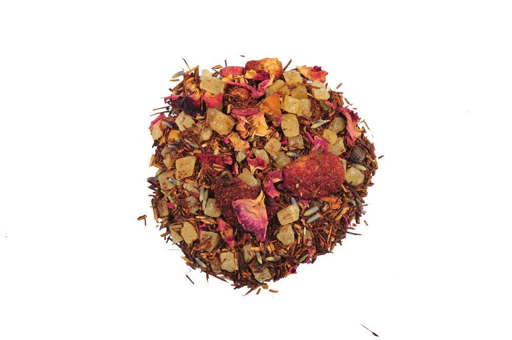 Južnoafriški čaj rooibos, kateremu so dodani kandiran ananas in mango, vrtnični listi, cvetovi sivke, jagodni in vanilijevi koščki.