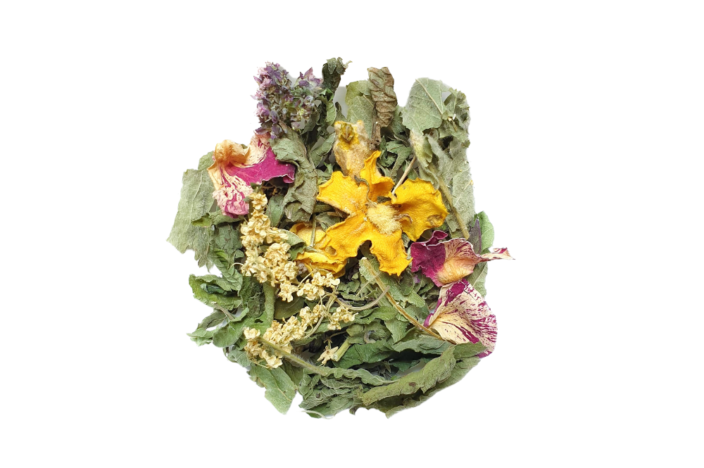 Sestavine: *melisa, *citronka, *dobra misel, *rman, *komarček, *plahtica, *meta, *šetraj, *lipa, *bezeg, *materina dušica, *kopriva, *kamilica in drugi sezonski cvetovi