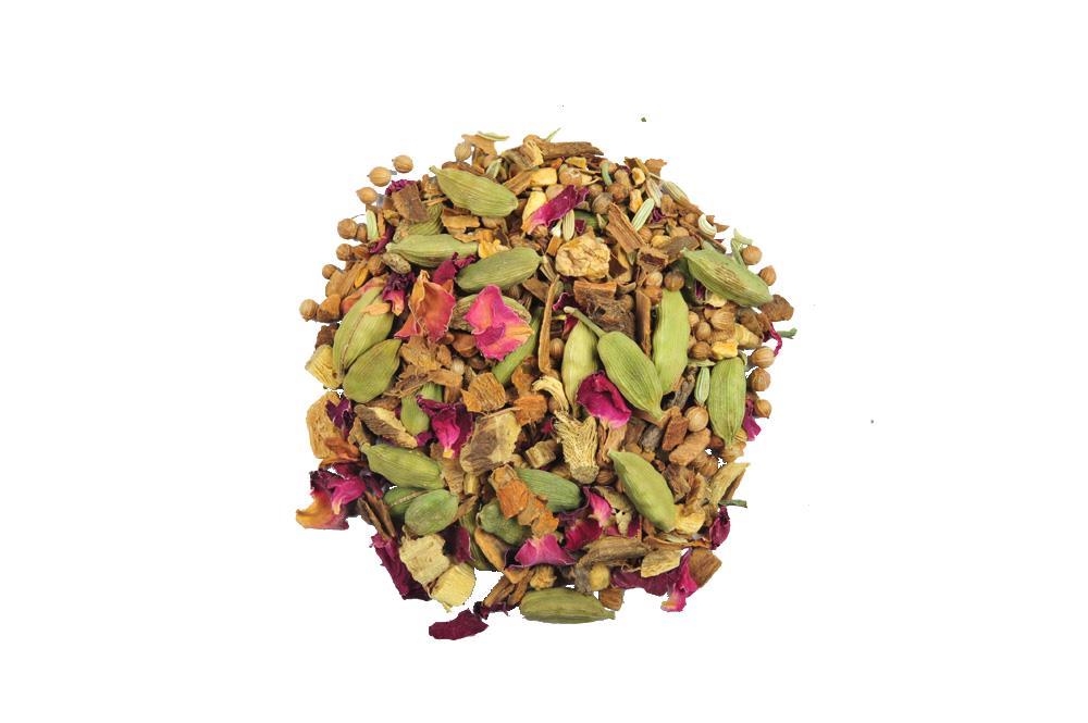 Nežna ajurvedska čajna mešanica s pretežno sladkim in prijetno zaokroženim okusom. Temeljne sestavine so kardamom, sladki koren in koriander, ki ustvarjajo mehak, harmoničen okusni profil. Sladki koren daje čaju naravno sladkobo in polnost, rožni cvetni listi pa mu dodajo elegantno, aromatično noto. Rahlo začimbni poudarki komarčka in ingverja poskrbijo za prijetno globino okusa.