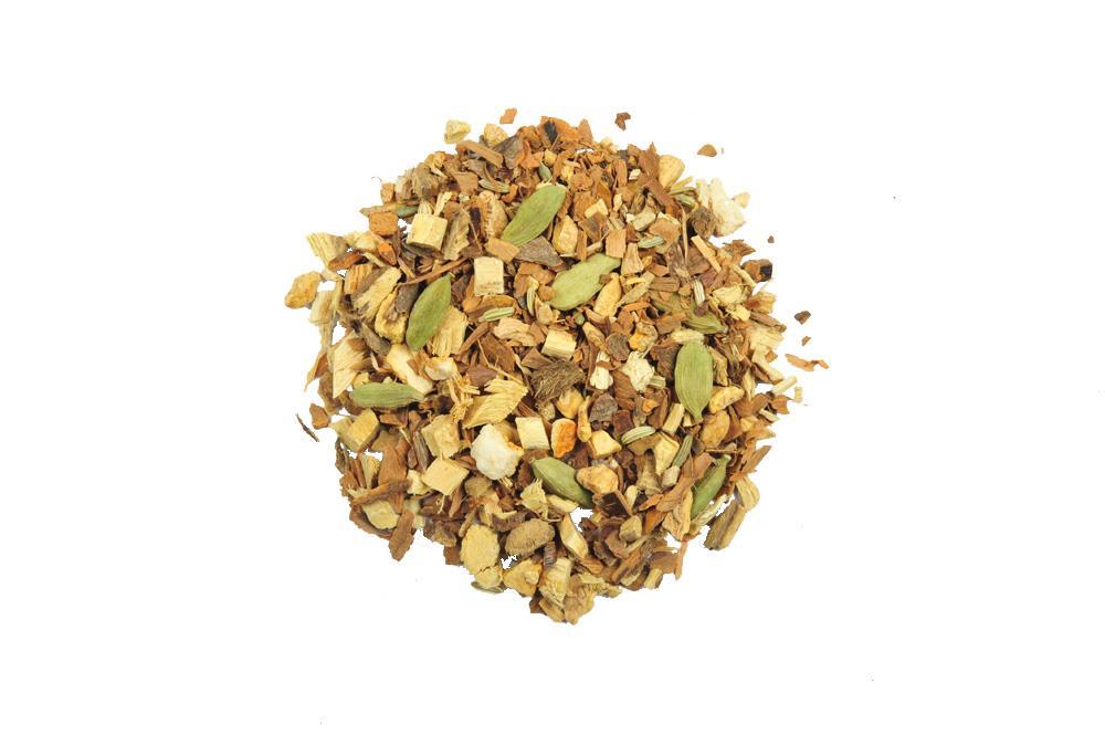 Bogata ajurvedska čajna mešanica s toplim, izrazito sladkim okusnim profilom. Cimet in sladki koren čaju podarita prijetno naravno sladkobo in mehkobo, ingver doda rahel pikanten poudarek, aromo pa lepo razširijo komarček, pomarančna lupina in kardamom.