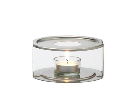 Gorilnik iz nerjavečega jekla s priloženo čajno svečko v stekleni posodici.